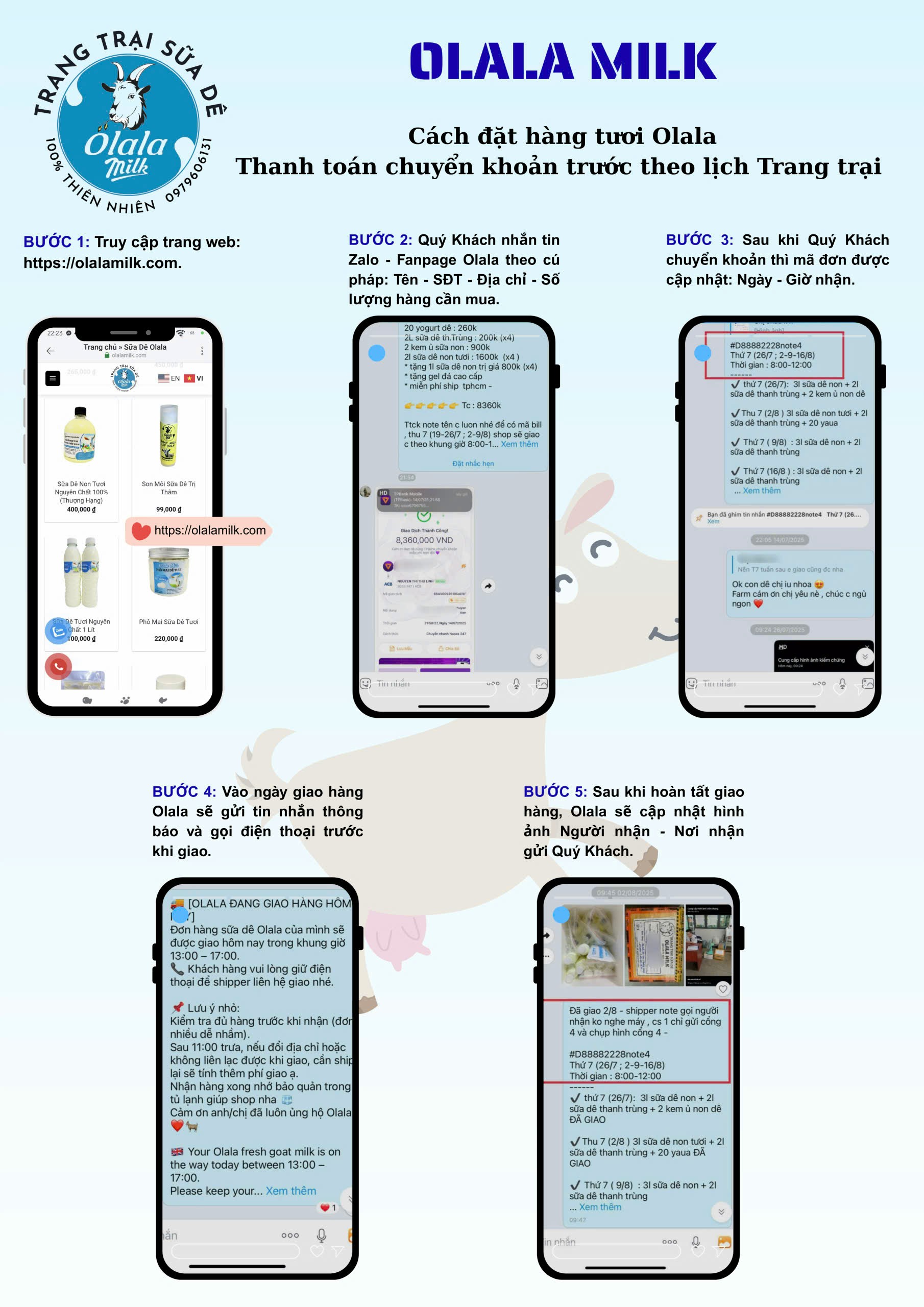 Bước 2 : Khách nhắn tin trực tiếp Fanpage OLALA MILK hoặc Zalo : 0979606131 gồm tên – địa chỉ – điện thoại và số lượng đơn cần mua trước 5-7 ngày do số lượng khách đông . OLALA sẽ chốt bill và khách chuyển khoản nếu là hàng tươi
