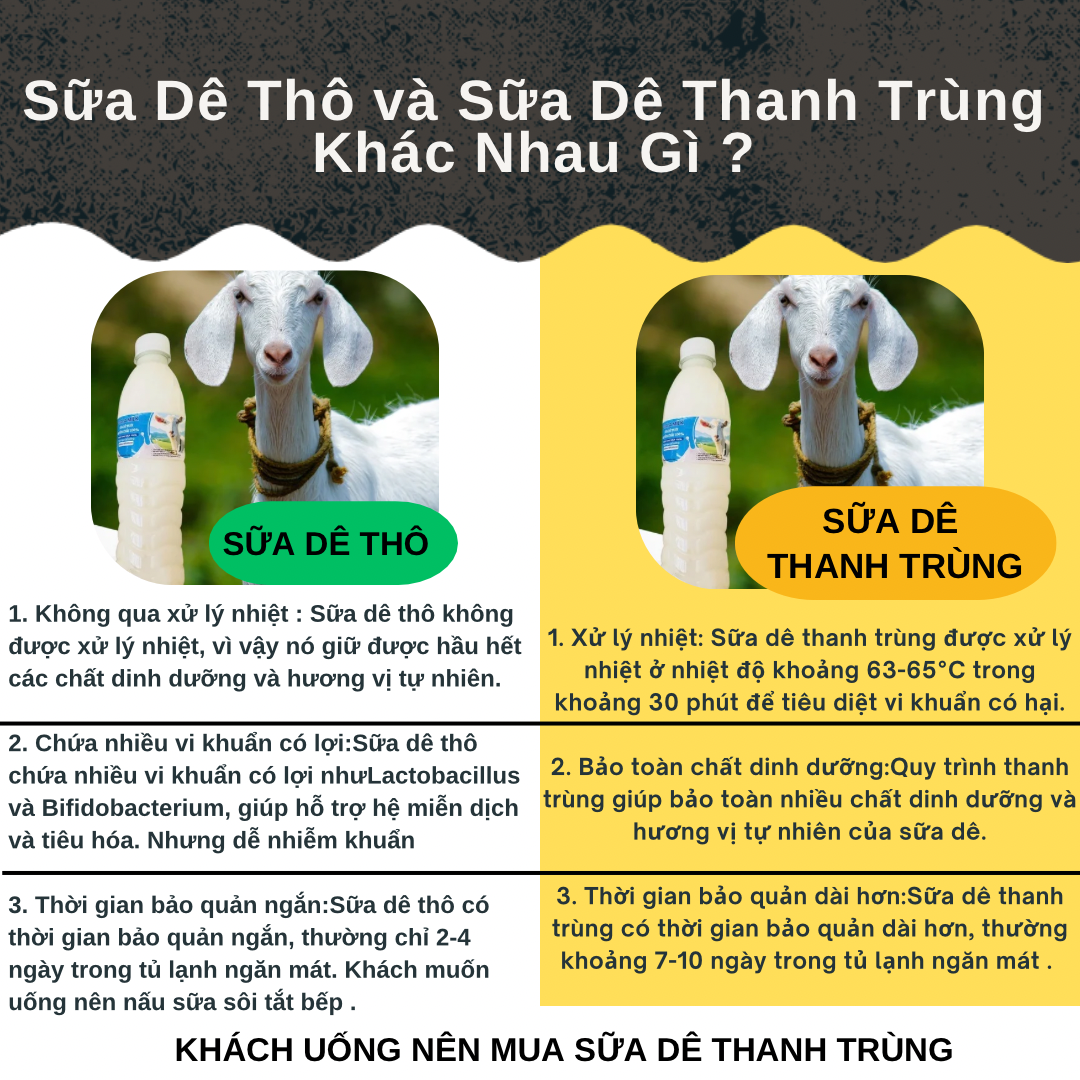 Tóm lại, sữa dê thô giữ được nhiều chất dinh dưỡng và vi khuẩn có lợi, nhưng có thời gian bảo quản ngắn và nguy cơ nhiễm khuẩn , kí sinh trùng và dị ứng cao . Sữa dê thanh trùng được xử lý nhiệt để tiêu diệt vi khuẩn có hại, nhưng vẫn bảo toàn nhiều chất dinh dưỡng và có thời gian bảo quản dài hơn. Khách uống nên mua loại thanh trùng .